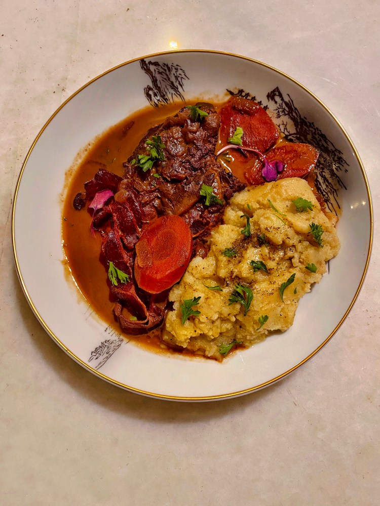 - To serve, plate the mashed potatoes. Remove the bay leaf and thyme from the Coq au Vin and plate the chicken on the side of the mashed potatoes and then ladle the sauce and veggies over the chicken. Sprinkle with fresh parsley & voila!