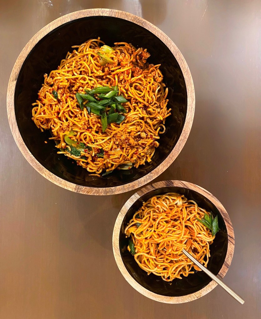 - In the wok on medium heat, add the white parts of the spring onion and cook for 1-2 minutes. Add the sauce that you prepared earlier. Add the boiled noodles and minced chicken to the sauce mixture and stir it around.