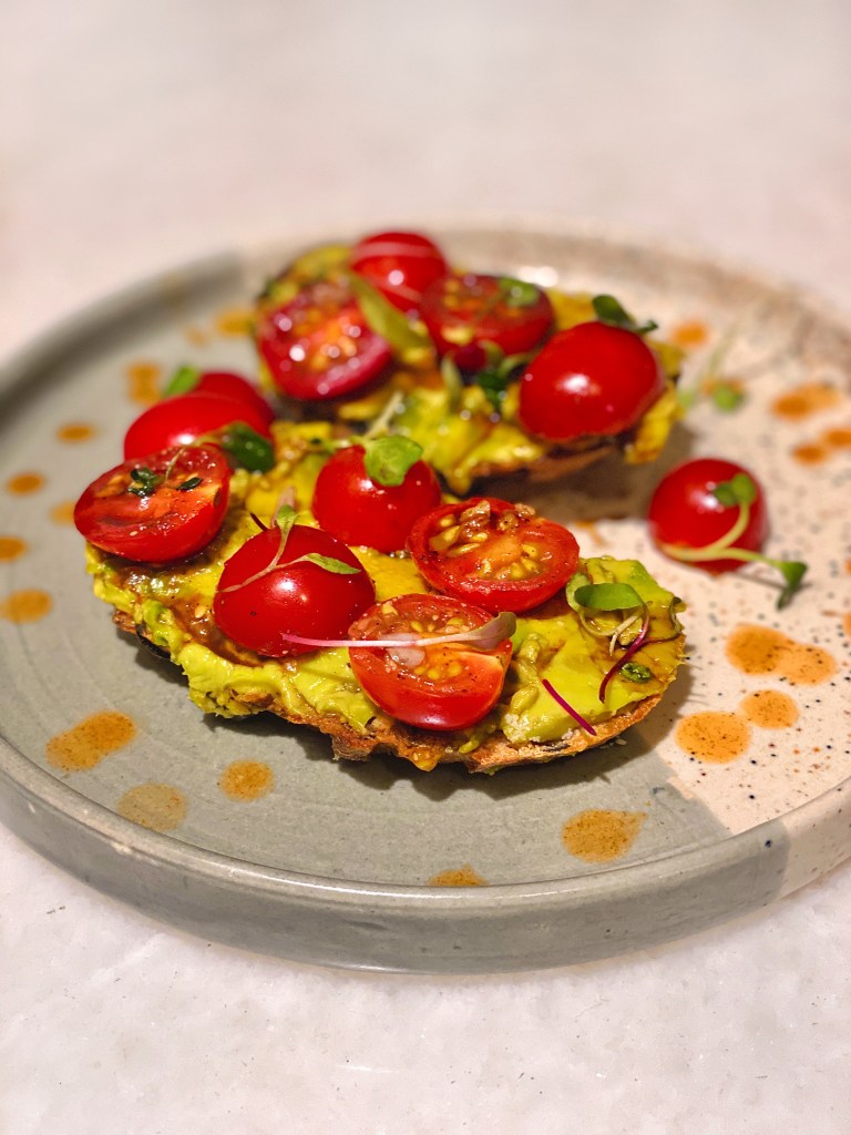 - Then, place toast on a serving platter. Smear the smashed avocado and then top it off with the cherry tomato mixture.