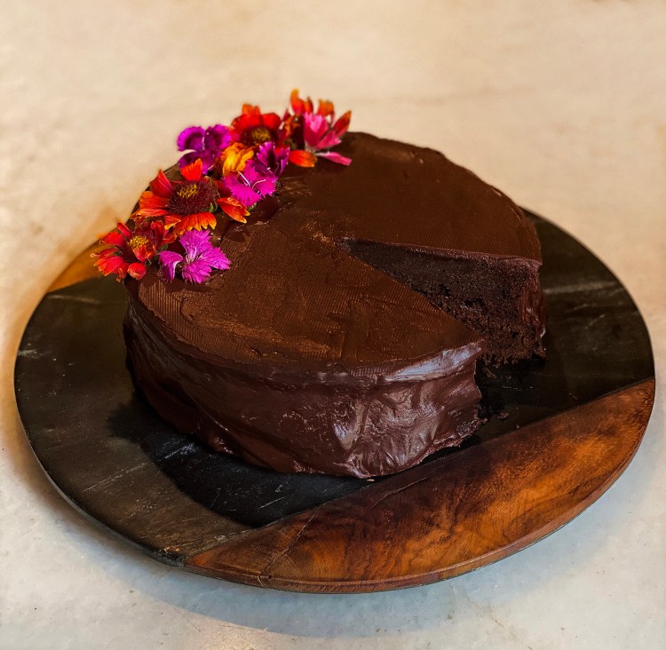 - Spread a thick layer of the warm glaze between the 2 layers. Then, pour until it fully covers the cake. Garnish with edible flowers or fruits or leave as it is.