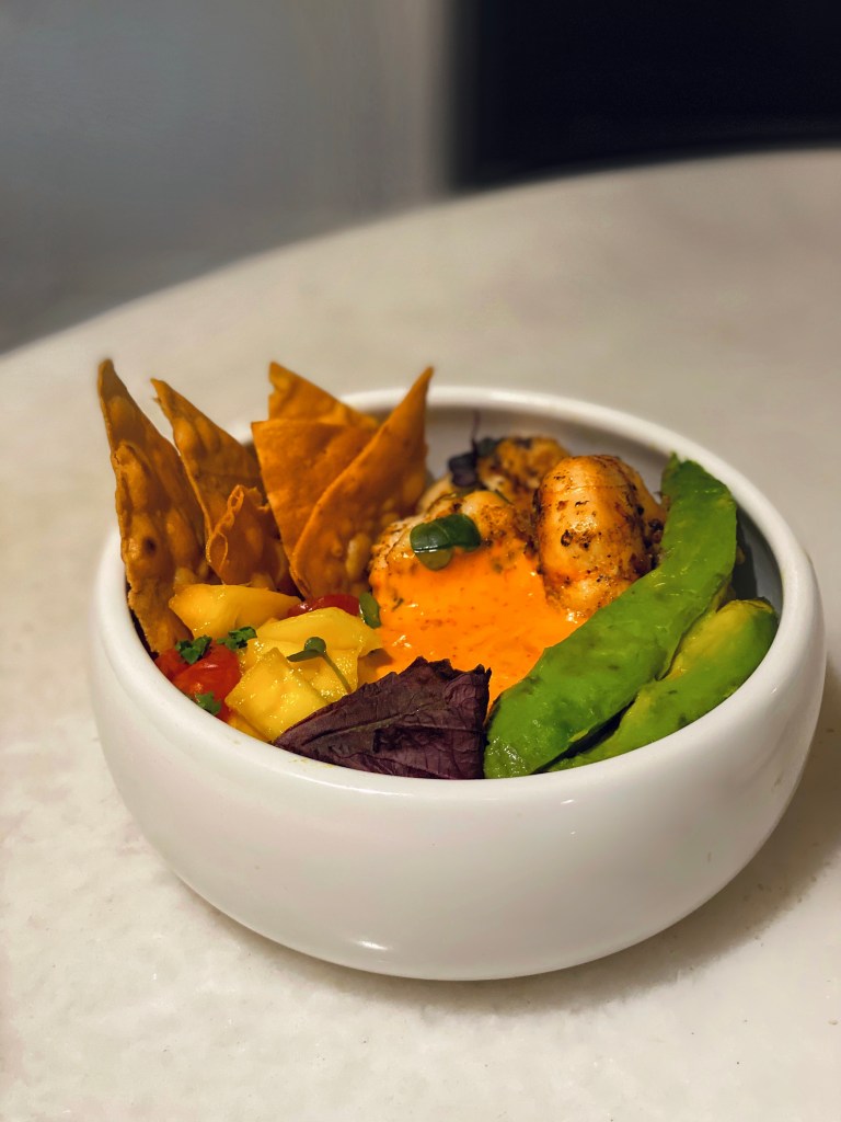 - Plate grilled shrimp, mango salad, leafy greens, avocado slices and crispy tortilla chips into a large bowl. Drizzle some chipotle sauce and sprinkle taco seasoning, just before digging in!