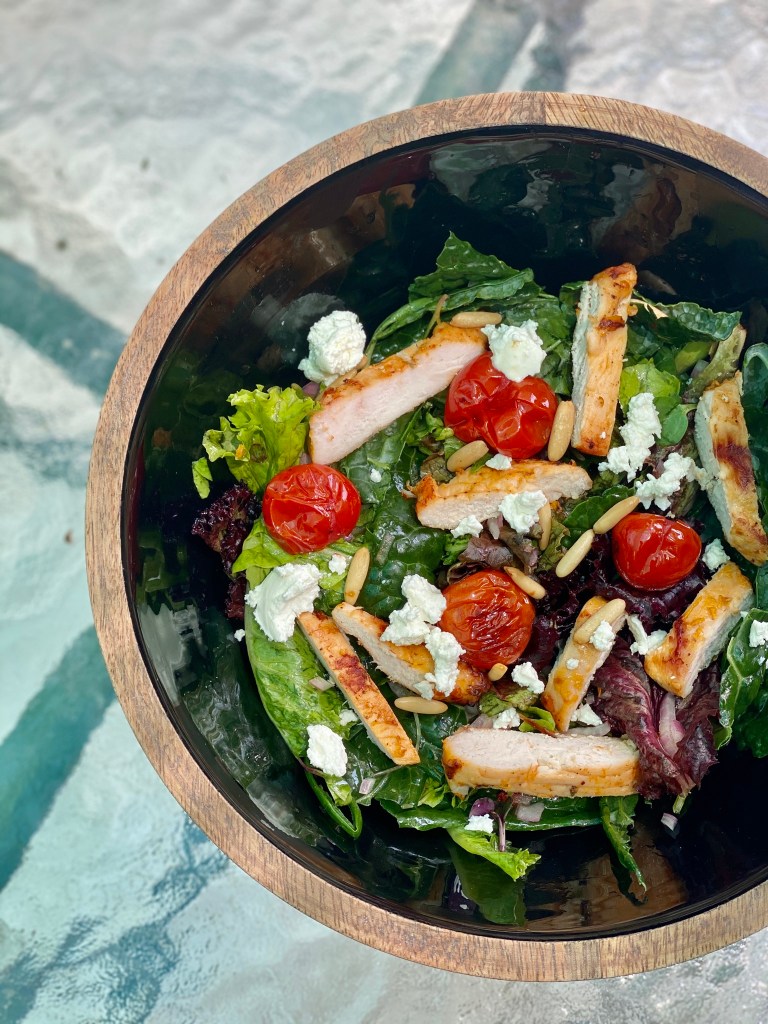 - Top this with your chicken strips, pine nuts and crumbled feta and enjoy!