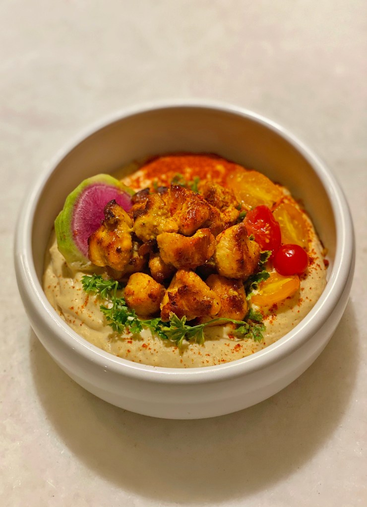 - To assemble: Add chilled hummus to a bowl and top it off with the sizzling hot harissa chicken. Drizzle some olive oil over the hummus, and garnish with fresh cherry tomatoes, radish, parsley and a whole lot of smoked paprika.