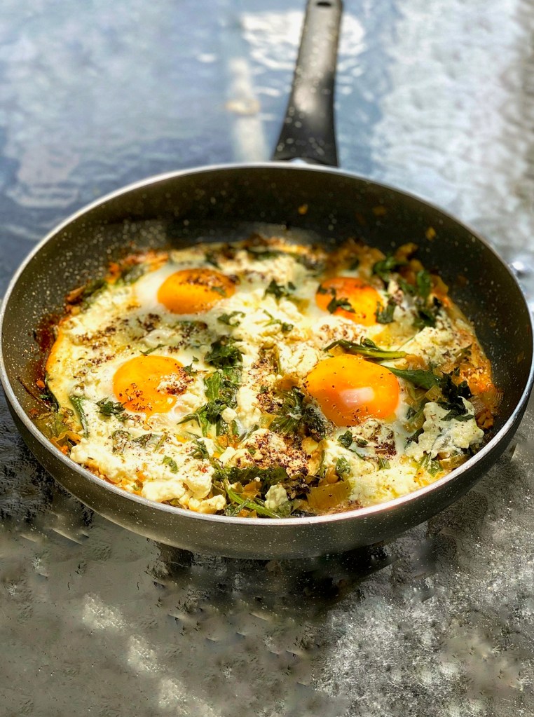 - Once slightly cooked – add feta cheese gently (don’t break the yolks!). Cover with the lid.