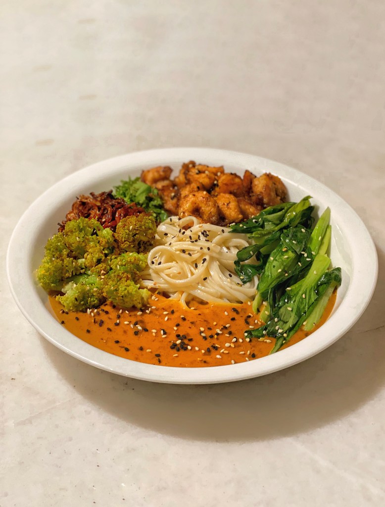 - Plate it however you like in a big noodle bowl. We went The Grammar Room route and poured the curry first, then placed the noods in the center, surrounded by the prawn karaage, fresh coriander, caramelised onions, broccoli and bok choy. Top it off with black & white sesame seeds.