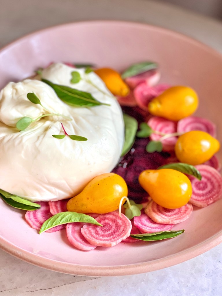 - Slice the beets and add ’em to a small bowl. Add the cherry tomatoes & fresh basil leaves to the same bowl. Toss with some oil oil, balsamic, salt & pepper.